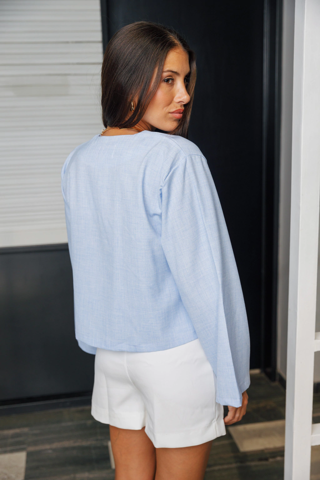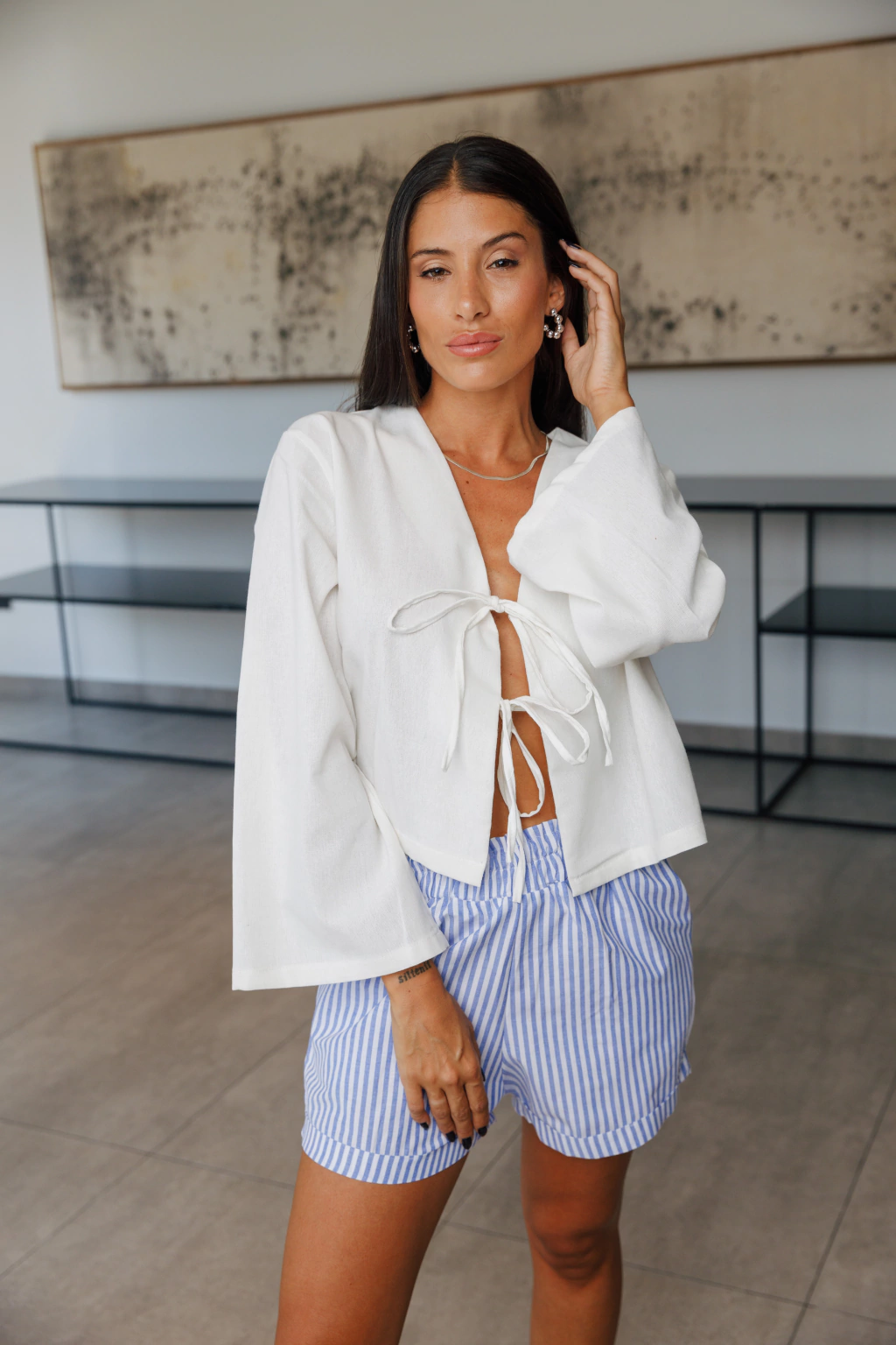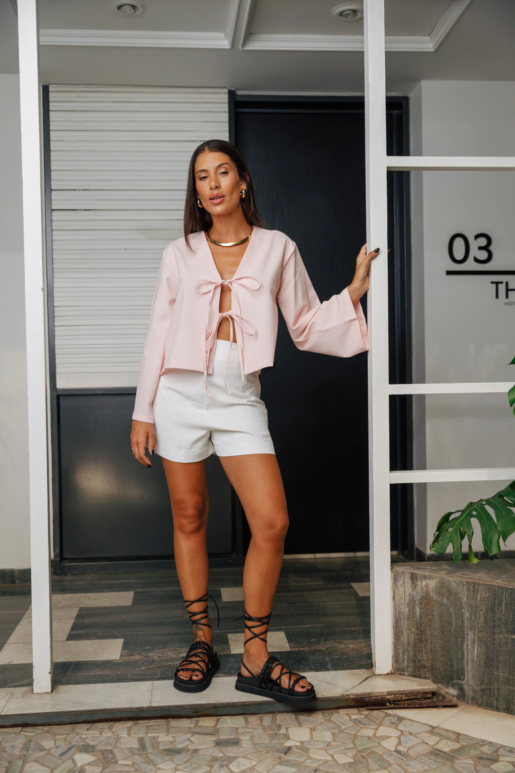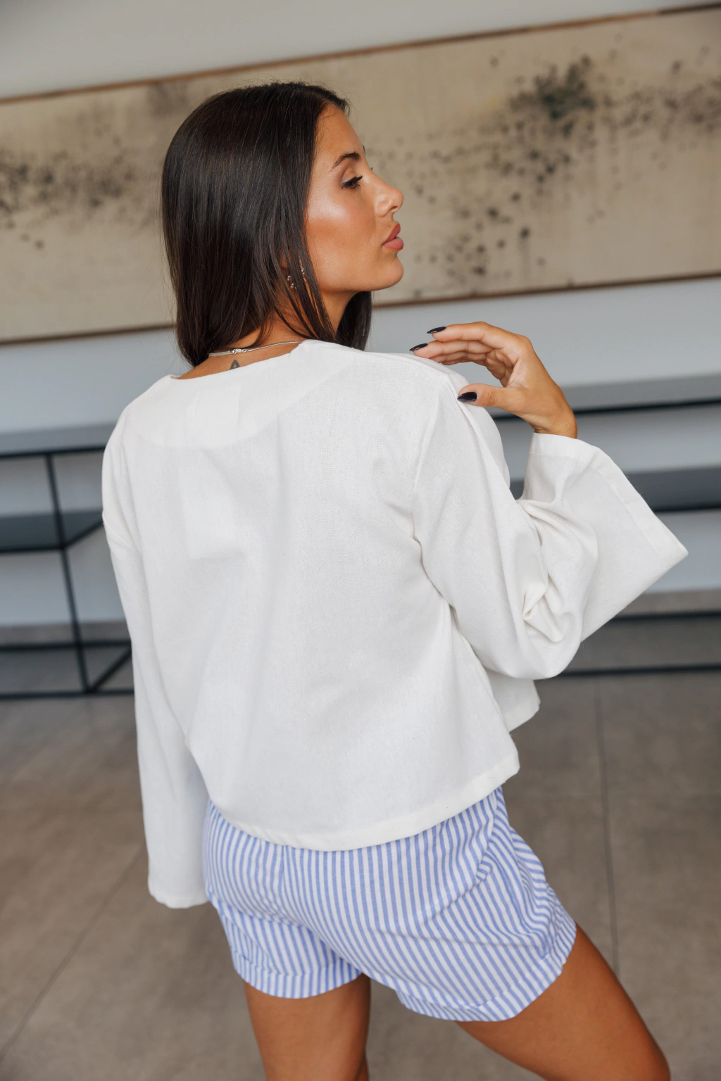 Blusa en lino sastrero y lino melange, escote cerrado en V con lazos regulables que definen la apertura de la prenda. Vistas de costuras en mismo textil.