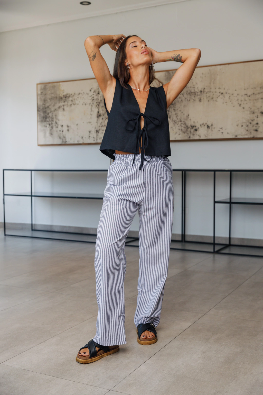 Chaleco-Blusa en lino sastrero y lino melange, escote cerrado en V con lazos regulables que definen la apertura de la prenda. Vistas de costuras en mismo textil.