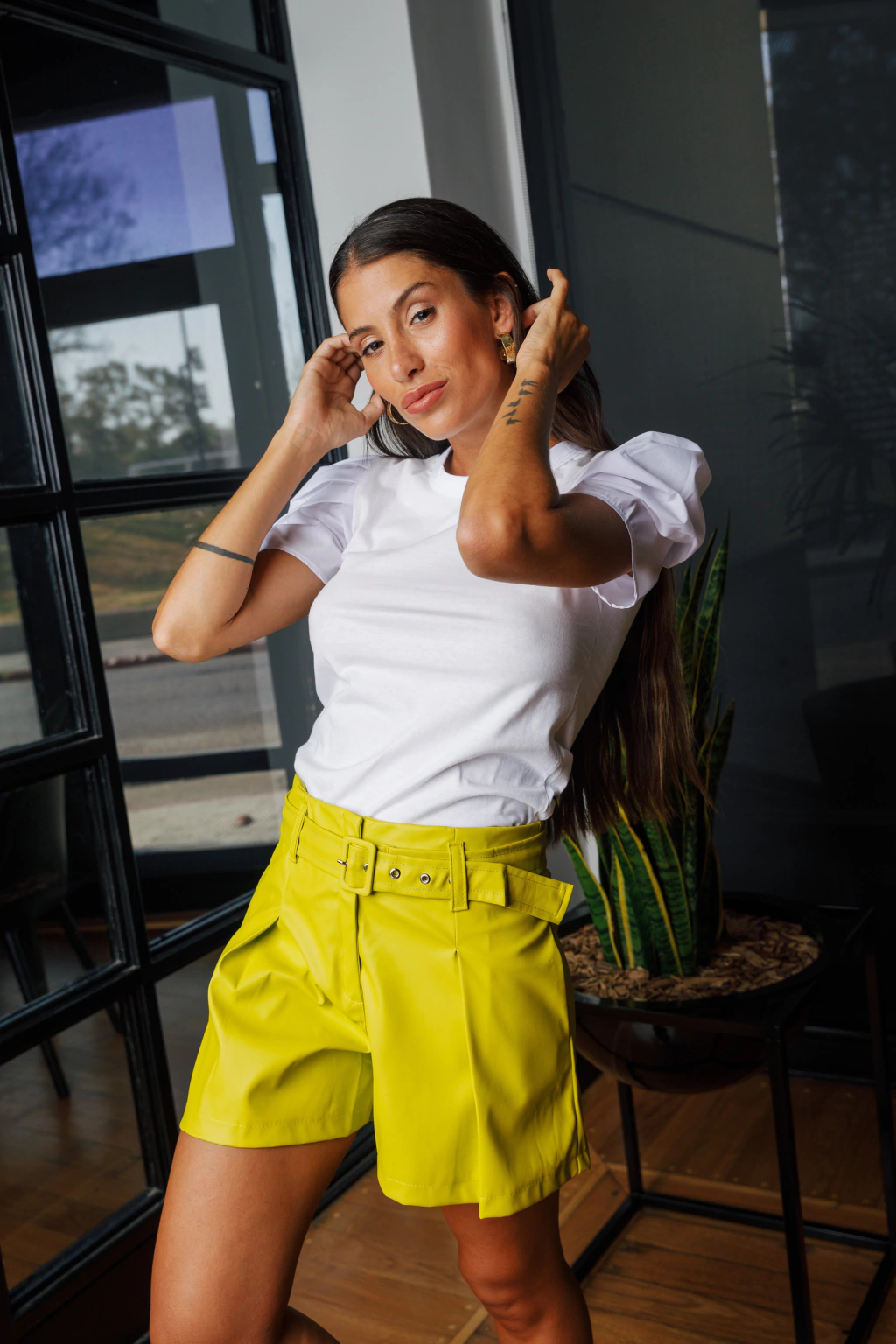 Short en símil cuero, tiro alto y cintura con pasacintos. Bolsillos laterales y falso ojal en espalda. Cinturón con hebilla metálica forrada a tono en el mismo textil. Detalle de pliegues en delantero.