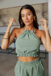 Top en algodón guantanamo (lino liviano) escote americano regulable con detalle de frunce y volado pequeño en cuello y cintura. Elástico en espalda que genera amplitud en la prenda para adaptar el talle a diferentes medidas.